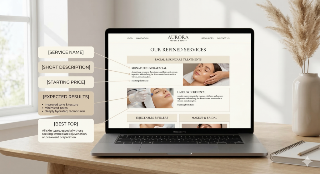 Many beauty businesses list services briefly, but the most effective salon and med spa websites explain each service clearly. When clients understand exactly what they are booking, they feel more confident scheduling an appointment.
